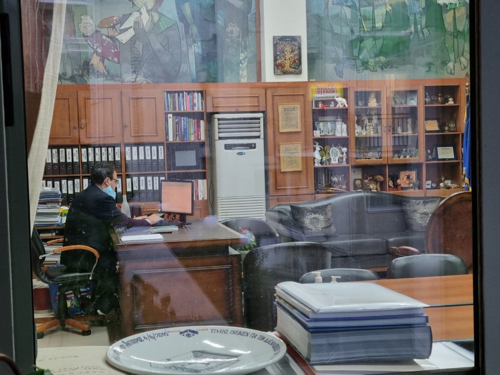 Διακρίνεται σε… παπαράτσι φωτογραφία από το απέναντι μπαλκόνι στο γραφείο του να μελετάει νέα σχέδια και να ετοιμάζει νέες προτάσεις, όχι μόνο για τα Τρίκαλα αλλά και για τη λειτουργία των Δήμων στη νέα εποχή, όστις τυγχάνει και πρόεδρος της ΚΕΔΕ.