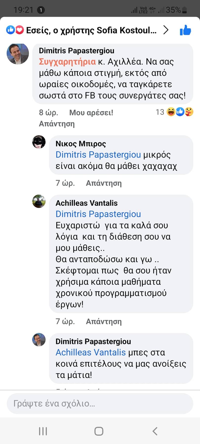Πειραχτήρι ο τελευταίος-γνωστό τοις πάσι-τον συνεχάρη δημόσια και σχολίασε κάτω από την ανάρτηση ότι “θα του μάθει πως να ταγκάρει πρόσωπα στο facebook”. Ο Βανταλής σήκωσε το γάντι απευθύνοντας ευχαριστίες και υποσχόμενος πως θα ανταποδώσει με μαθήματα για το… πως παραδίδονται έγκαιρα τα προγραμματισμένα έργα. Ε, και ο Παπαστεργίου με το φλεγματικό του χιούμορ τον κάλεσε δημόσια να μπει στα κοινά “για να μας ανοίξεις τα μάτια”!… Οικογενειακή υπόθεση… Δείτε τα σχόλια: