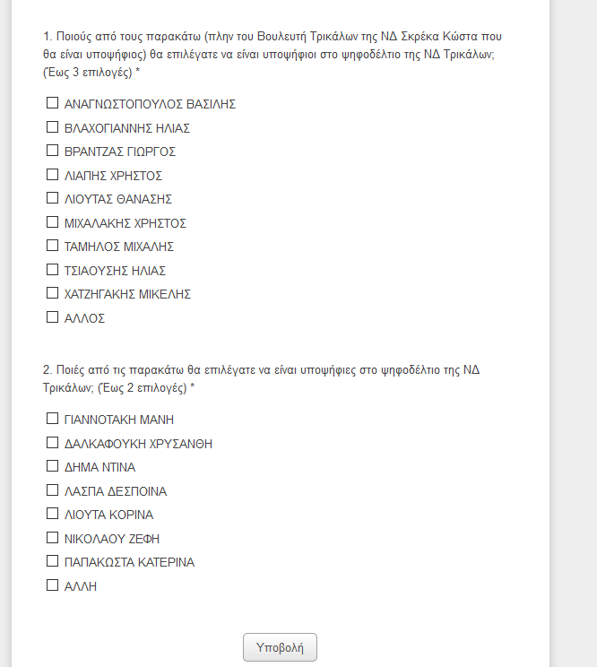 Το πρώτο «ποιους από τους παρακάτω (πλην του Κ. Σκρέκα που θα είναι υποψήφιος) θα επιλέγατε ως υποψηφίους στο ψηφοδέλτιο της Ν.Δ. Τρικάλων» και δίνει τα εξής ονόματα: