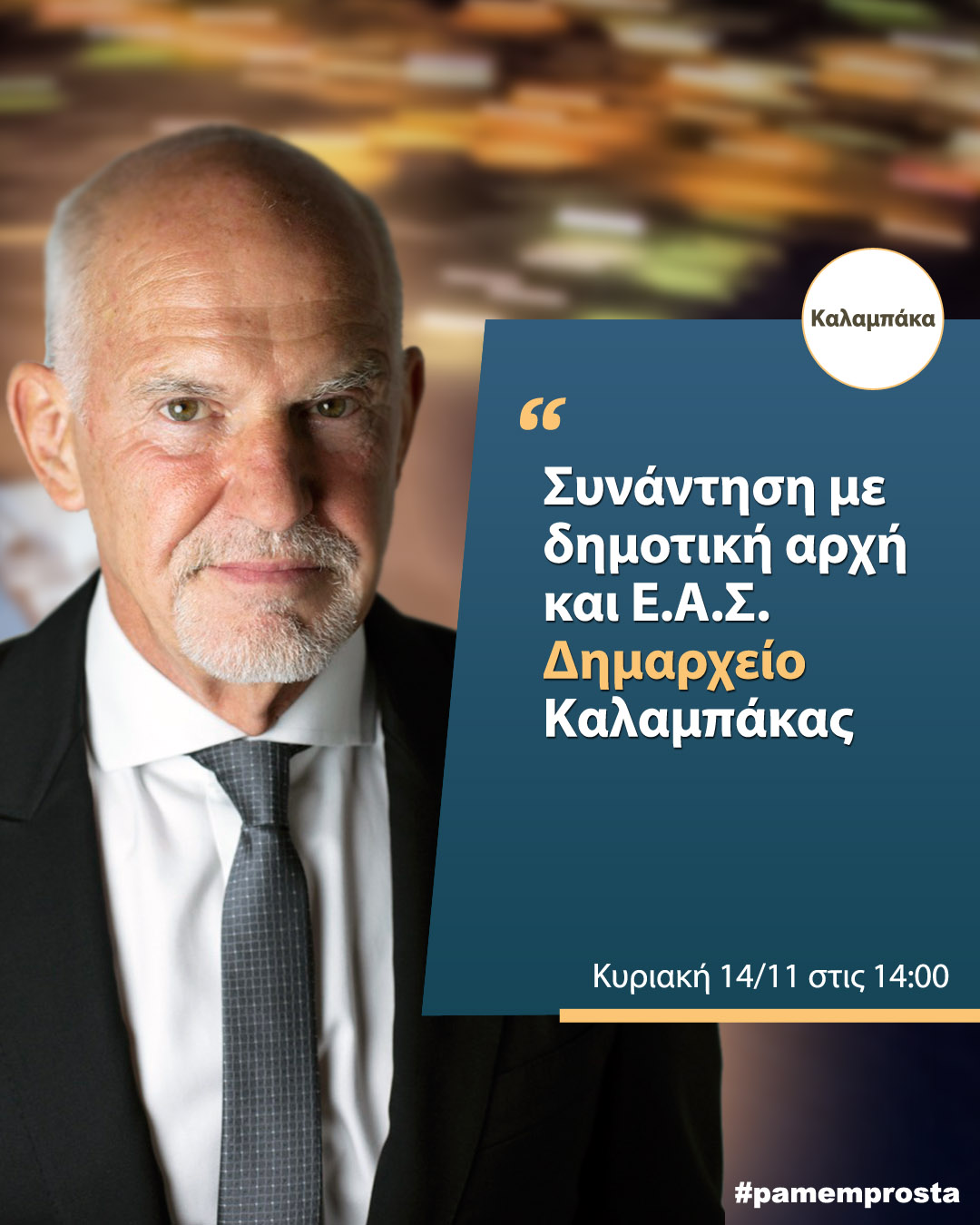 Την Καλαμπάκα θα επισκεφτεί την Κυριακή ο Γιώργος Παπανδρέου. Ο υποψήφιος πρόεδρος του ΚΙΝ.ΑΛ. θα βρεθεί στο Δημαρχείο, για να συναντήσει τον δήμαρχο Θοδωρή Αλέκο και μέλη της ΕΑΣ Καλαμπάκας.