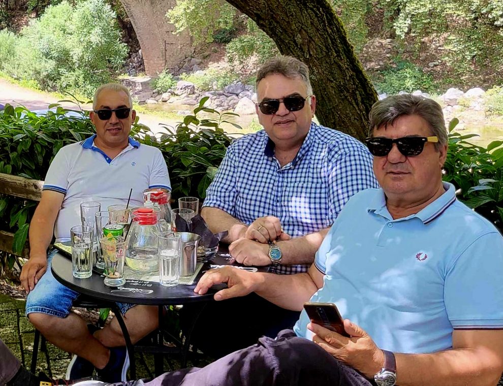 Διακρίνεται μέρες καύσωνα κάτω απ’ τον παχύ τον ίσκιο των πλατάνων με τον πρόεδρο του Ροπωτού Γιάννη Λαμπρογεώργο και τον παλιό αυτοδιοικητικό της Πύλης Τάκη Τριχιά, αναλύοντας τα δρώμενα στην περιοχή της Πόρτας.