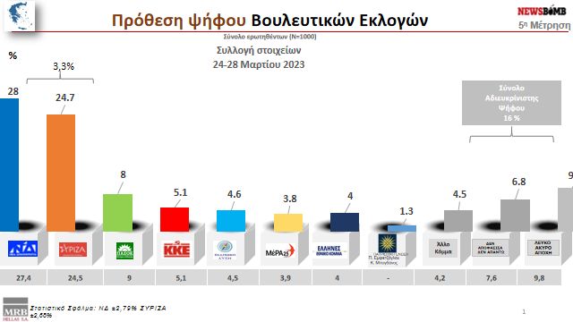 Για το διάστημα 24 έως 28 Μαρτίου του 2023 και σε ότι αφορά την αναγωγή επί των εγκύρων ψηφοδελτίων φαίνεται η Νέα Δημοκρατία να αγγίζει το 30,8% και ο ΣΥΡΙΖΑ να βρίσκεται στο 27,2%. Η διαφορά δηλαδή διαμορφώνεται στο 3,6%. Στα ίδια ποσοστά εμφανίζονται τα δύο μεγάλα κόμματα και στην προηγούμενη μέτρηση που έγινε 6 με 13 Μαρτίου με τη διαφορά μεταξύ τους επί των εγκύρων να βρίσκεται στο 3,2%. Υπάρχει όμως επί της ουσίας μία μικρή αύξηση της ψαλίδας υπέρ της Νέας Δημοκρατίας και είναι της τάξης του 0,4%. Σε ότι δε αφορά τις αναγωγές επί του συνόλου εις τις οποίες συμπεριλαμβάνονται και η αδιευκρίνιστη ψήφος, η ψαλίδα για τις τελευταίες μέρες του Μαρτίου φαίνεται να διαμορφώνεται στο 3,9%. Η Νέα Δημοκρατία φτάνει στο 33,3% και ο ΣΥΡΙΖΑ στο 29,4%. Στο προηγούμενο διάστημα της μέτρησης που έγινε 6 με 13 Μαρτίου και στην αναγωγή επί του συνόλου η ψαλίδα ήταν ακόμη πιο κάτω στο 3,5% μεταξύ Νέας Δημοκρατίας και ΣΥΡΙΖΑ.