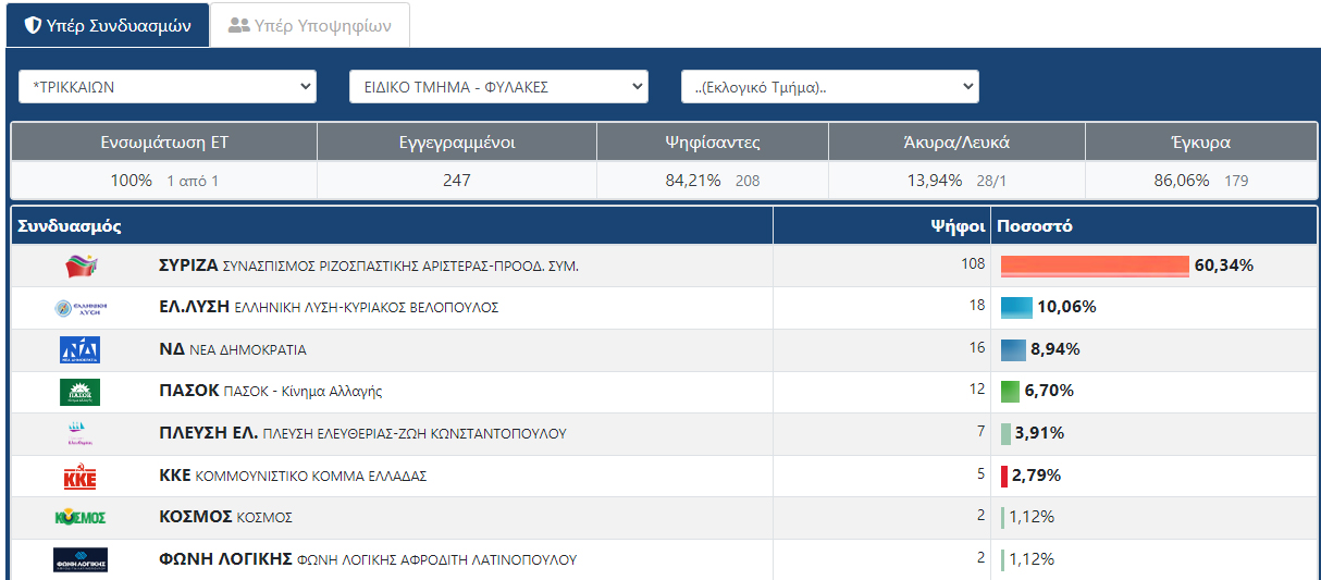 Εκεί και σύμφωνα με τα επίσημα αποτελέσματα του ΥΠΕΣ το κόμμα της αξιωματικής αντιπολίτευσης έλαβε το εντυπωσιακό 60.34% (… ίσως και πανελλαδικό ρεκόρ) μιας και το ψήφισαν οι 108 από τους 208 συνολικά!… Για την ιστορία 2ο κόμμα στις φυλακές Τρικάλων αναδείχθηκε η “Ελληνική Λύση” με 18 ψήφους.
