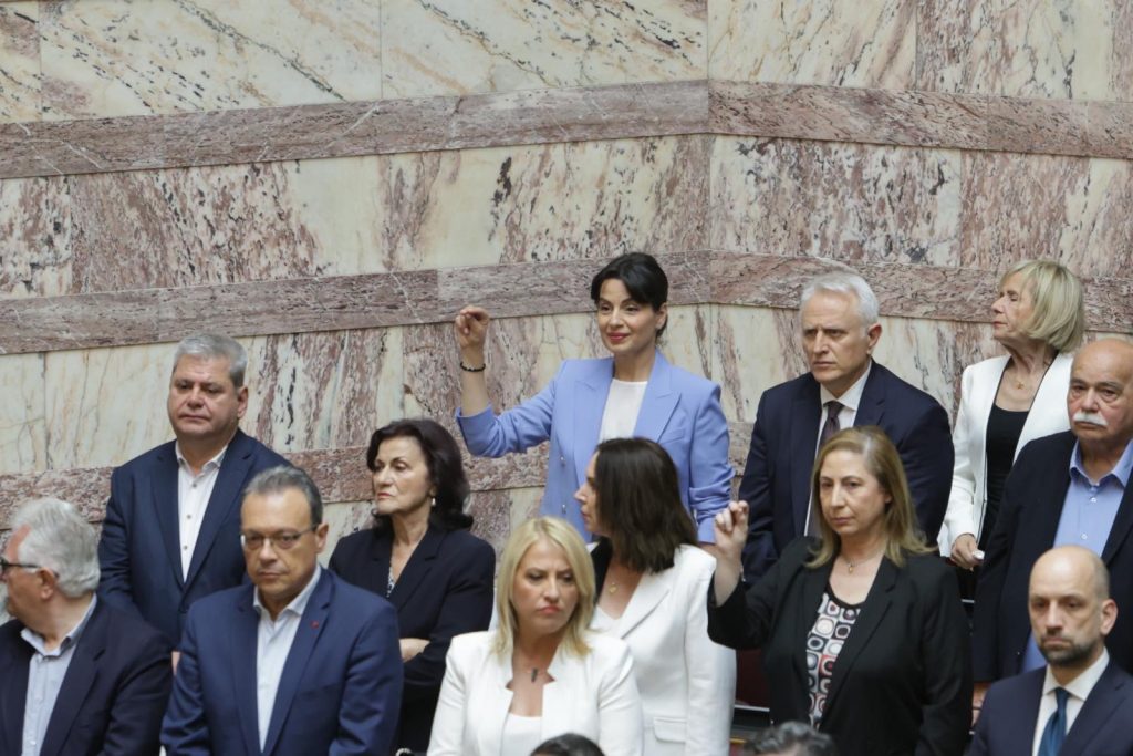 Τα βλέμματα παρέμειναν καρφωμένα πάνω της και κατά την τελετή ορκωμοσίας. Η ίδια εμφανίστηκε με ένα λιτό ταγέρ και έδωσε θρησκευτικό όρκο, στο πλευρό του συντρόφου της, βουλευτή Πειραιώς, Γιάννη Ραγκούση.