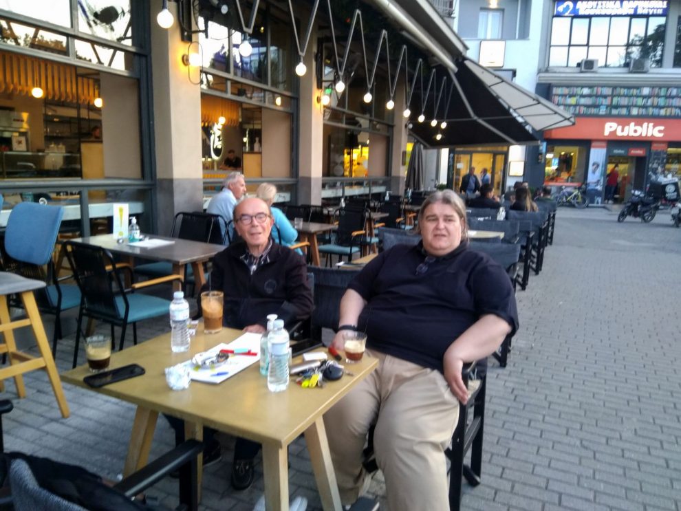 Διακρίνονται ο Τζίμης Καναβός με τον ζωντανό θρύλο του καφέ της πόλης, τον Κώστα Μπάνια, σε ατέρμονες συζητήσεις για το… αύριο της πόλης. Ω, ναι…