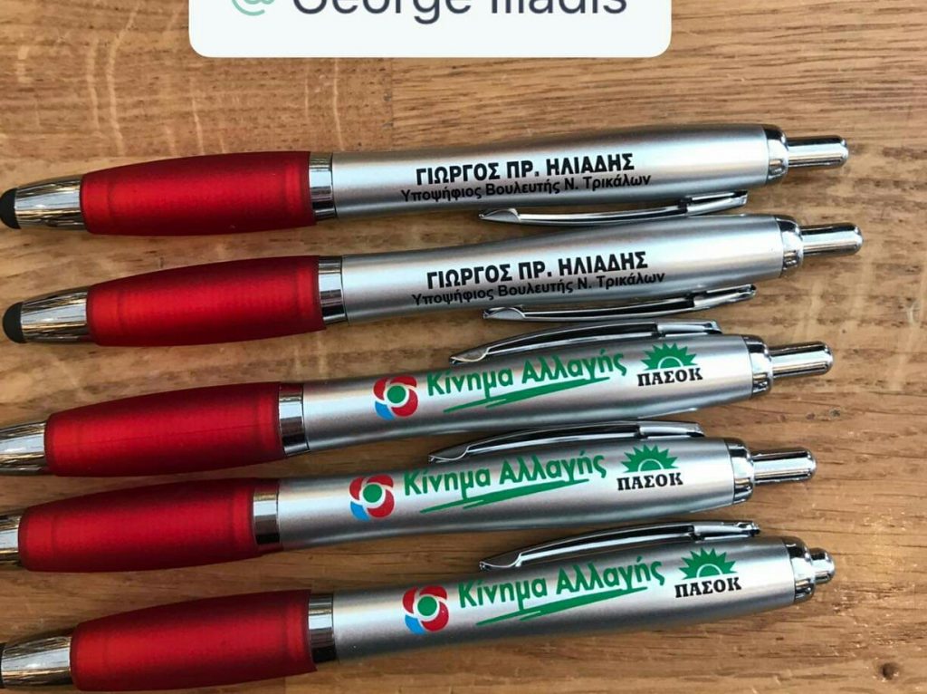 Θυμίζοντας παλιές καλές (ΠΑΣΟΚικές) εποχές ο υποψήφιος βουλευτής Τρικάλων του ΚΙΝ.ΑΛ. έβγαλε αναμνηστικά στυλό.