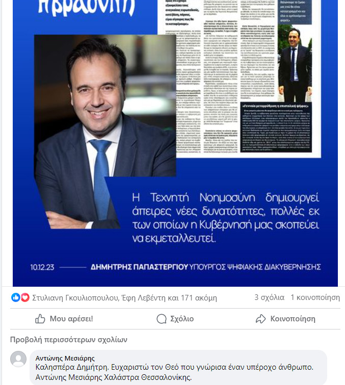 Λατρεία για τον τέως δήμαρχο Τρικκαίων και νυν υπουργό Ψηφιακής Διακυβέρνησης Δημήτρη Παπαστεργίου.