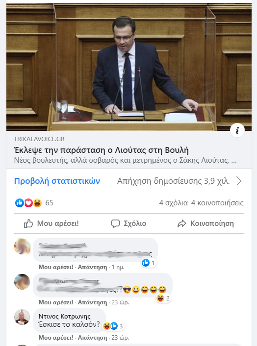 Δε φαίνεται να συμφωνεί και πολύ με τη διαπίστωση ο ιστορικός πρόεδρος της ΝΟΔΕ Τρικάλων Ντίνος Κοτρώνης, ο οποίος σχολίασε με τον δικό του φλεγματικό τρόπο κάτω από τη δημοσιευσή μας. Άμα “δεν τον πάει” κάποιος ο Κοτρώνης, δεν κρατιέται και ως φαίνεται οι σχέσεις του με τον βουλευτή της Ν.Δ. δεν είναι και τόσο καλές: