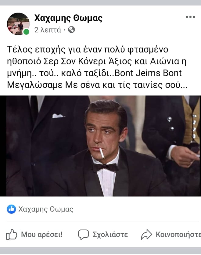 Ο μεγάλος δραματικός της τοπικής πολιτικής, συνδικαλιστικής, αυτοδιοικητικής και… υποκριτικής τέχνης, ο Θωμάς Χαχάμης, ο άνθρωπος που έπαιξε στην επική ταινία “Τα χρόνια της θύελλας”, στο “Μετέωρο βήμα του πελαργού”, αλλά και στη “Φανέλα με το Νο9” με τον Στράτο Τζώρτζωγλου αποχαιρετά τον Σον Κόνερι, ως εξής:
