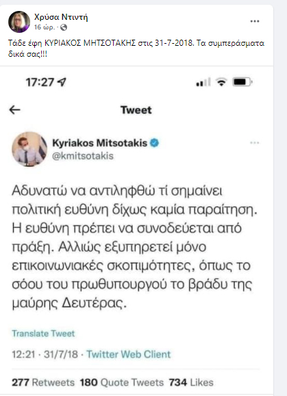 Παλιότερη δήλωση του πρωθυπουργού Κυριάκου Μητσοτάκη ο οποίος σαν αρχηγός της αξιωματικής αντιπολίτευσης δήλωνε το 2018 μετά την καταστροφή στο Μάτι ότι δεν μπορεί να αντιληφθεί ανάληψη πολιτικής ευθύνης χωρίς παραιτήσεις, επαναφέρει στις μνήμες μας η Χρύσα Ντιντή.