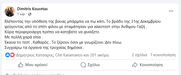 “Βλέποντας την υπόθεση της βανας μπάρμπα να πω κάτι. Το βράδυ της 31ης Δεκεμβρίου φεύγοντας από το σπίτι φίλου με σταμάτησαν για αλκοτεστ στην Άνθιμου Γαζή .
