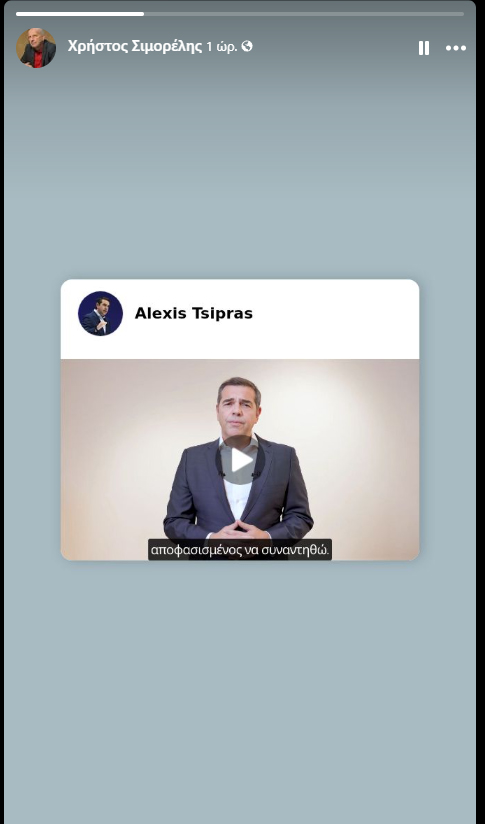 Story με το βιντεοσκοπημένο μήνυμα του Αλέξη Τσίπρα, ο οποίος παραιτήθηκε από βουλευτής και εκκινεί τις διαδικασίες για νέο κόμμα, έκανε ο Χρήστος Σιμορέλης.