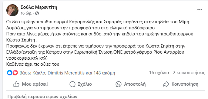 Γιατί οι δυο πρωθυπουργοί οι οποίοι εκκωφαντικά δεν προσήλθαν στην κηδεία του επίσης πρώην πρωθυπουργού Κώστα Σημίτη, λίγε μέρες μετά πήγαν στην κηδεία του Μίμη Δομάζου. Και έγραψε σχετικά η πρώην βουλεύτρια: