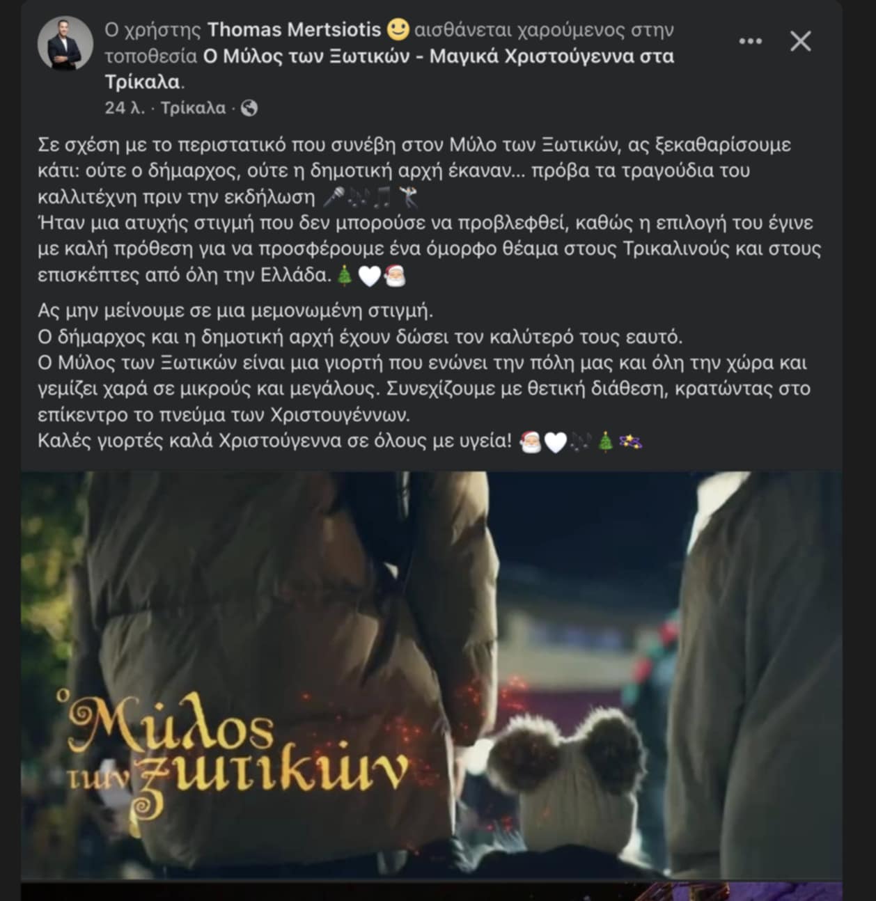 Και λέει: “Σε σχέση με το περιστατικό που συνέβη στον Μύλο των Ξωτικών, ας ξεκαθαρίσουμε κάτι: ούτε ο δήμαρχος, ούτε η δημοτική αρχή έκαναν… πρόβα τα τραγούδια του καλλιτέχνη πριν την εκδήλωση