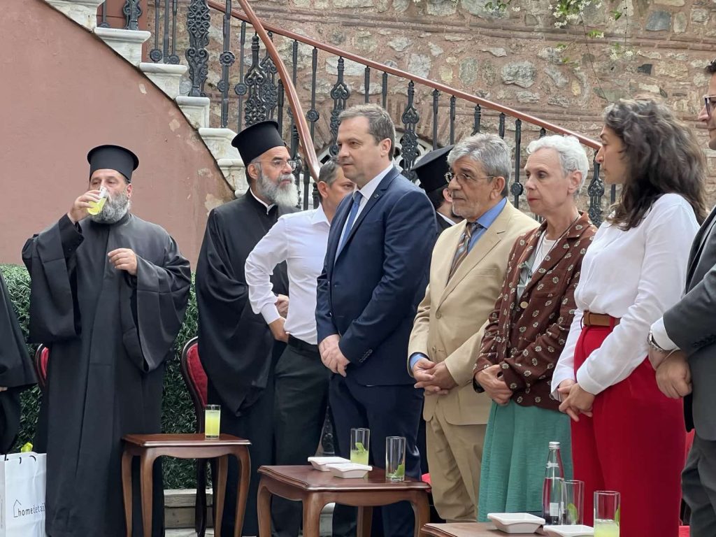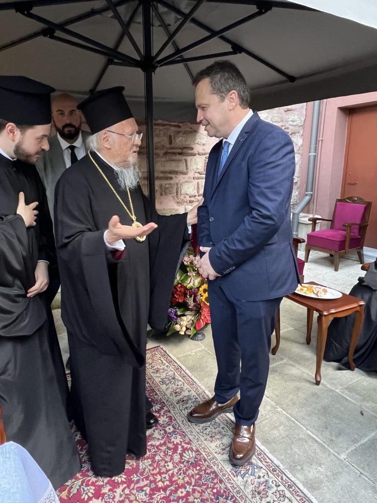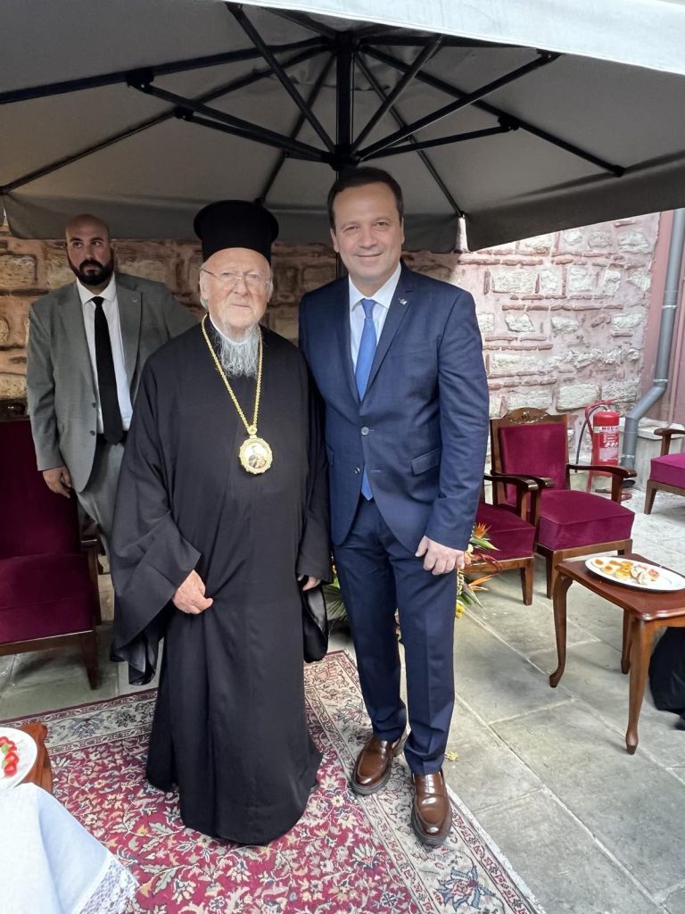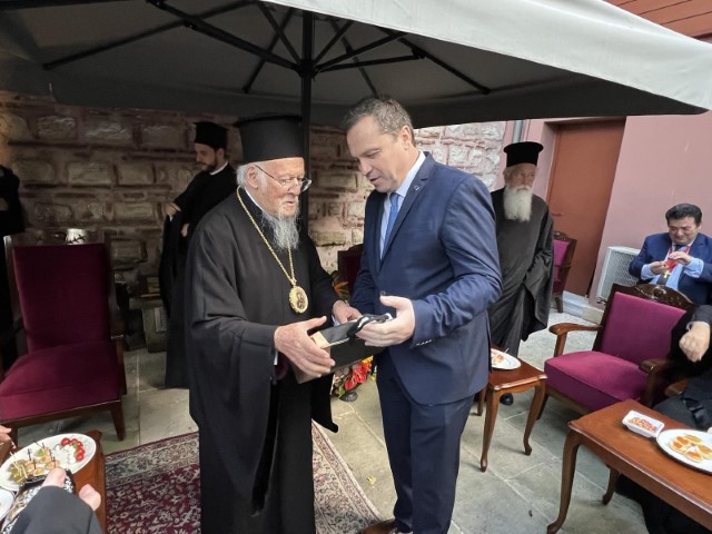 Ο Τρικαλινός βουλευτής παρακολούθησε τη Θεία Λειτουργία στον Πατριαρχικό Ναό Αγίου Γεωργίου και αμέσως μετά πέρασε στους κήπους του Πατριαρχείου μαζί με Αρχιερείς και πολιτικούς και ευχήθηκε στον κ. Βαρθολομαίο. Μάλιστα του παρέδωσε και ένα δώρο, ενώ του μετέφερε την αγάπη όλων των Τρικαλινών.