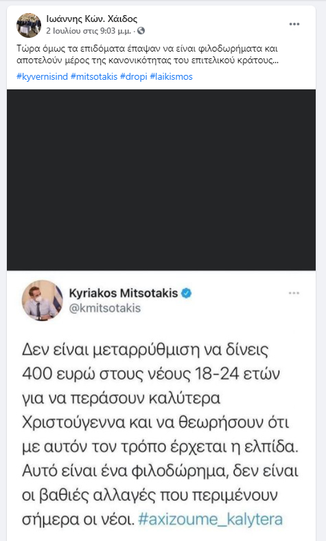 Με αφορμή το… δώρο των 150 € που δίνει ο Κυριάκος Μητσοτάκης στους πιτσιρικάδες που θα εμβολιαστούν ανέσυρε από το πολύτιμο αρχείο του δήλωση αυτού, ως επικεφαλής της αντιπολίτευσης, που κατηγορούσε την τότε Κυβέρνηση Τσίπρα για επιδόματα στους νέους: “Τώρα όμως τα επιδόματα έπαψαν να είναι φιλοδωρήματα και αποτελούν μέρος της κανονικότητας του επιτελικού κράτους…” σχολιάζει χαρακτηριστικά ο Γιάννης Χάιδος: