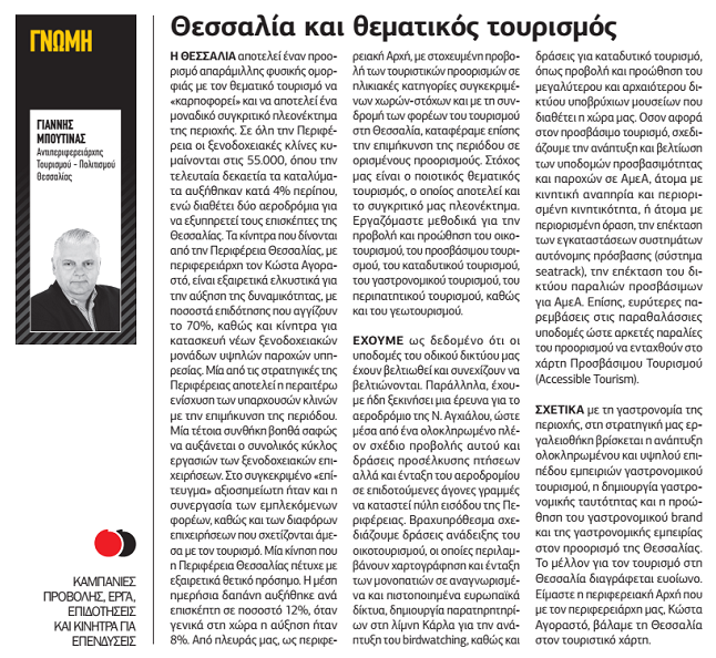 Στον Ελεύθερο Τύπο του Σαββάτου 14-1-23 φιλοξενήθηκε άρθρο του Αντιπεριφερειάρχη Τουρισμού και Πολιτισμού της Περιφέρειας Θεσσαλίας  Γιάννη Μπουτίνα για τον θεματικό τουρισμό στη  Θεσσαλία .