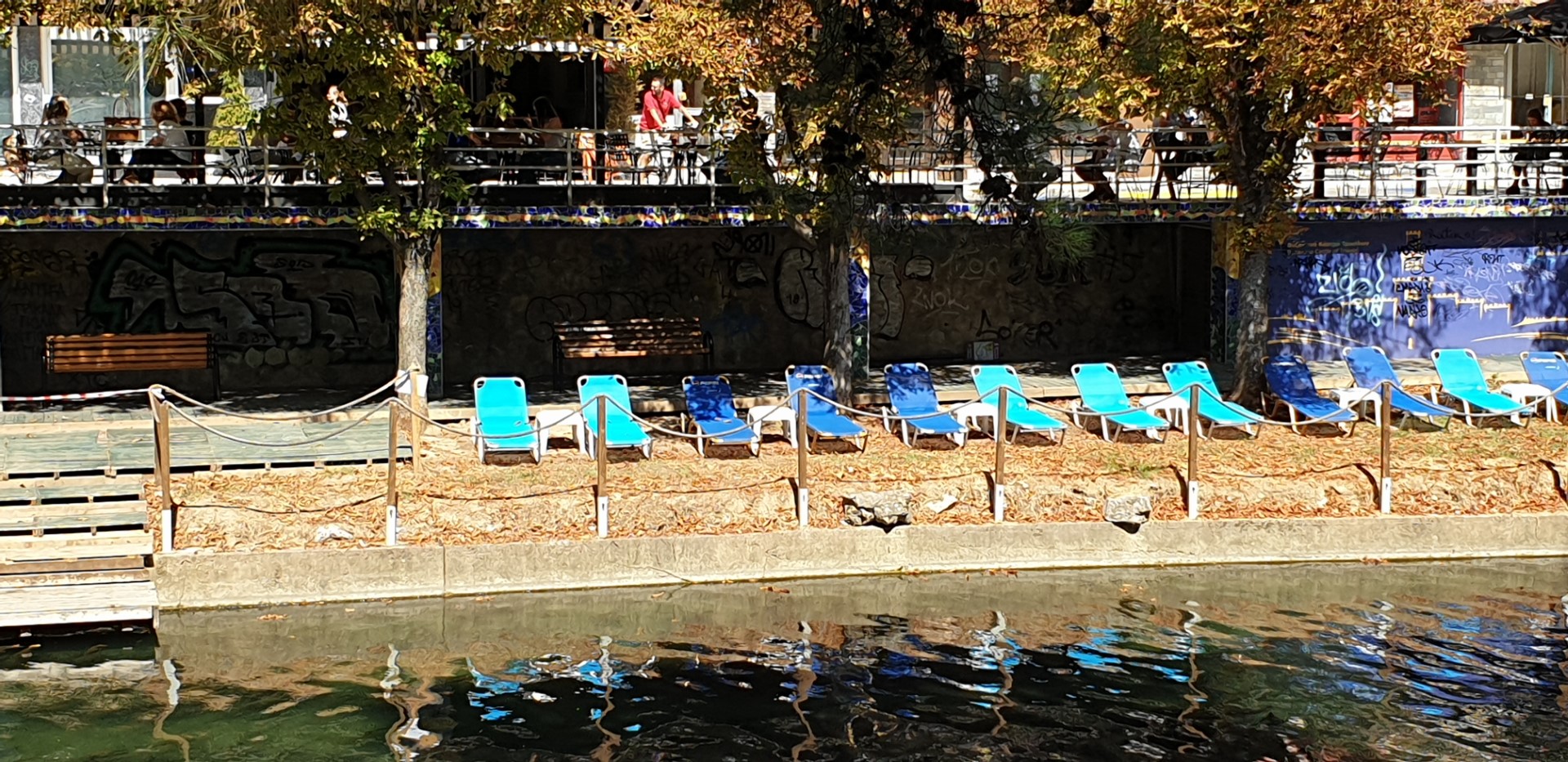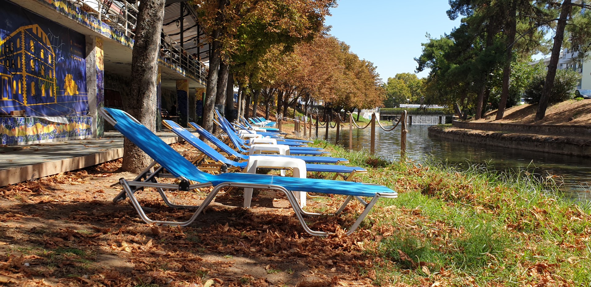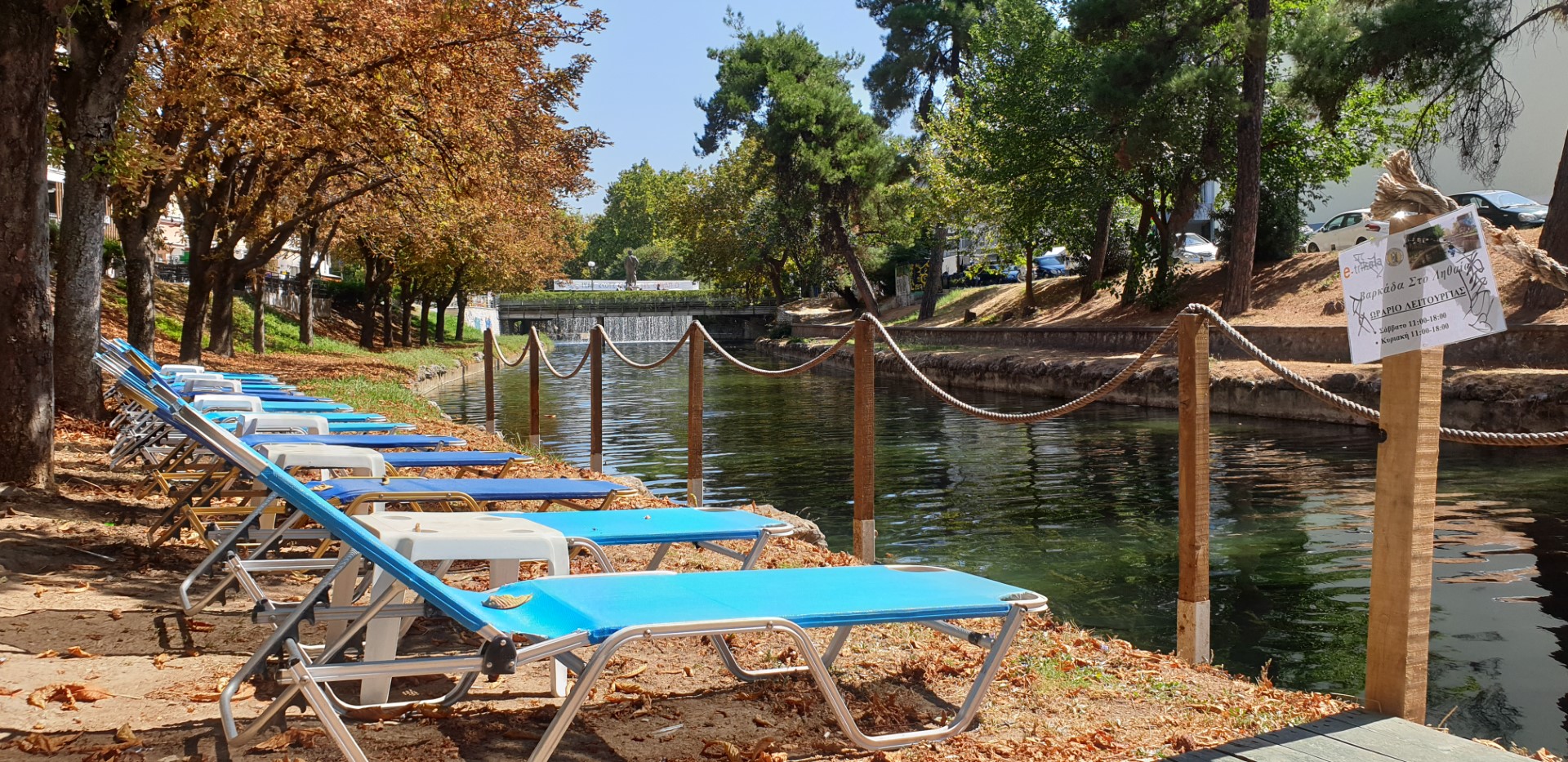 Όπως καταγράφει το trikalavoice.gr κάτω από την παραποτάμια οδό Αμαλίας που έκλεισε πειραματικά και για μια εβδομάδα με στόχο να πεζοδρομηθεί (δείτε ΕΔΩ) στήθηκαν ξαπλώστρες και τραπεζάκια για να απολαμβάνει όποιος θέλει το ποτάμι… σαν να είναι θάλασσα.