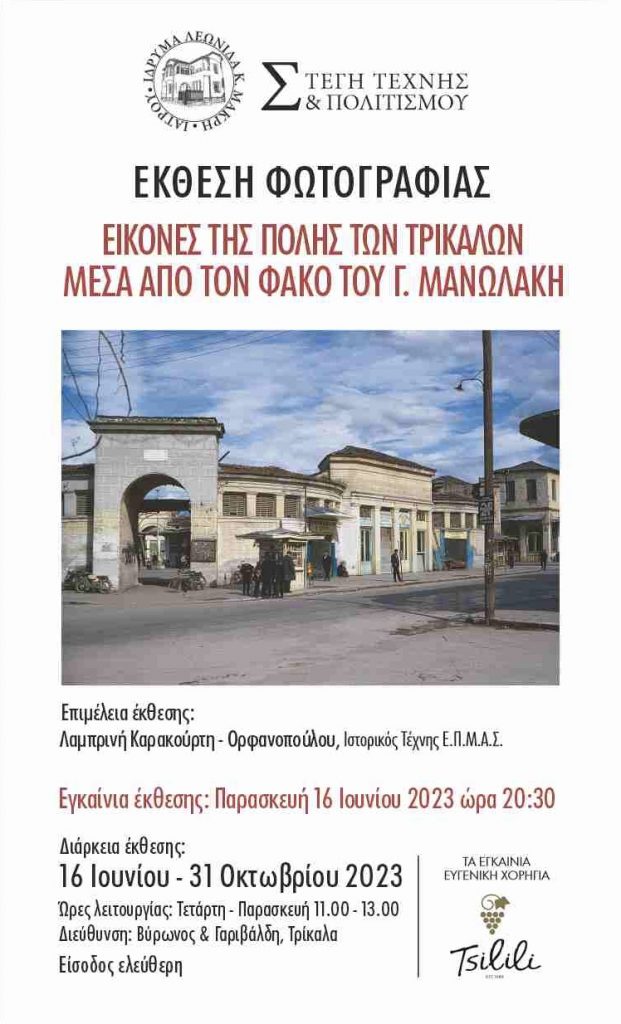 Το Ίδρυμα Λεωνίδα Κ. Μακρή – ιατρού εγκαινιάζει την Παρασκευή 16 Ιουνίου 2023 στις 20:30 στο κτίριο της Στέγης Τέχνης & Πολιτισμού του Ιδρύματος, την έκθεση φωτογραφίας από το αρχείο του Γεωργίου Μανωλάκη (1918 – 2007) «Εικόνες της πόλης των Τρικάλων μέσα από τον φακό του Γ. Μανωλάκη», σε επιμέλεια Λαμπρινής Καρακούρτη – Ορφανοπούλου, Ιστορικού Τέχνης Ε.Π.Μ.Α.Σ..