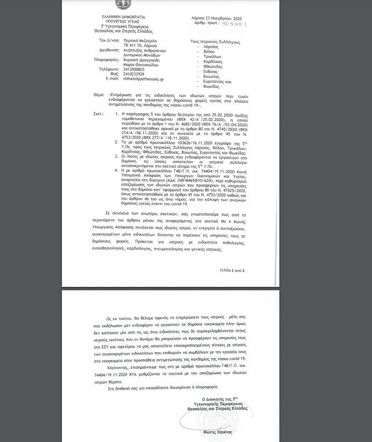 Συγκεκριμένα απευθύνεται δραματική έκκληση προς τους ιδιώτες Ιατρούς, μέλη του Ιατρικού Συλλόγου Τρικάλων και των άλλων Θεσσαλικών Νομών να δηλώσουν την πρόθεση τους για συνδρομή στα αντίστοιχα τμήματα, μονάδες και κλινικές του ΕΣΥ. Όπως αποκαλύπτει το trikalavoice.gr και με το παρακάτω έγγραφο της 5ης ΥΠΕ καλούνται να ανταποκριθούν στο κάλεσμα γιατροί των παρακάτω ειδικοτήτων: