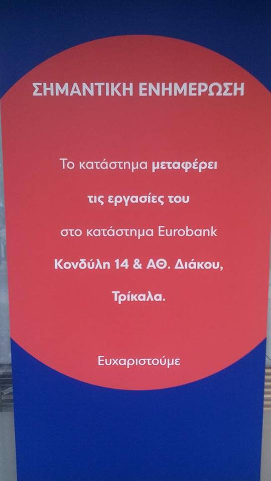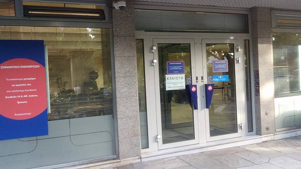 Πλέον η EUROBANK λειτουργεί και αυτή στα Τρίκαλα δυο καταστήματα (Κονδύλη το πρώτο καιν Στρατηγού Σαράφη στο ΤΤ το δεύτερο), όπως και η ALPHA και η ΠΕΙΡΑΙΩΣ. Σημειώνεται ότι κατά τη διάρκεια της κρίσης τα τραπεζικά καταστήματα στα Τρίκαλα περιορίστηκαν κατά τα… 2/3!!!