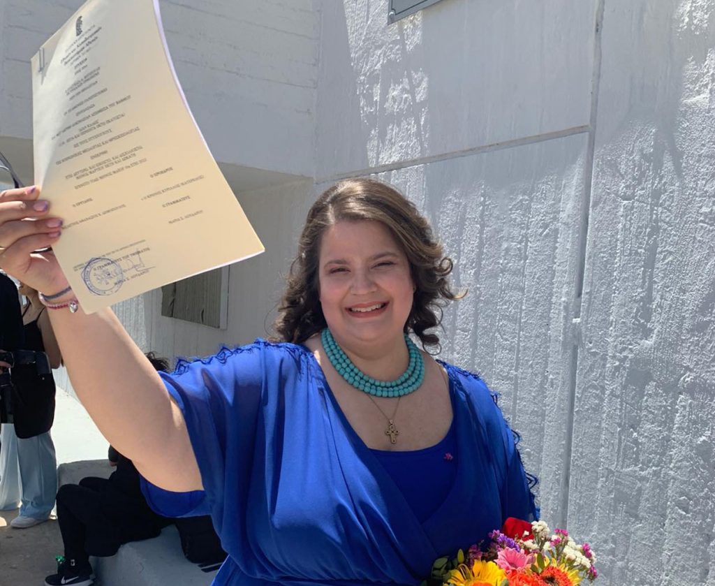 Η νεαρή Τρικαλινή έλαβε το πτυχίο της από το Τμήμα Κοινωνική Θεολογία και Θρησκειολογία και το πρωί της Τρίτης ορκίστηκε στο Εθνικό και Καποδιστριακό Πανεπιστήμιο Αθηνών. Η ίδια συγκινημένη λέει: “Χάριτι Θεού αξιώθηκα να περατώσω τις σπουδές μου ,στην σχολή της καρδιάς μου και ,πιο συγκεκριμένα ,κατέστην πτυχιούχος Κοινωνικής Θεολογίας και Θρησκειολογίας του Εθνικού και Καποδιστριακού Πανεπιστημίου Αθηνών (ΕΚΠΑ). Πράγματι ,η εισαγωγή μου στη συγκεκριμένη σχολή ,ήταν ,είναι και θα είναι για μένα ένα όνειρο ζωής . Όνειρο ζωής ,το οποίο κατάφερα να φέρω ,εις πέρας ,ύστερα από κόπους ,μόχθους ,αγωνίες και προσπάθειες τις οποίες ,ποτέ δεν θα λησμονήσω . Όλα αυτά τα ακαδημαϊκά έτη ήταν γεμάτα ,από ωραίες ,ευλογημένες εμπειρίες . Πάντα θα έχω στην καρδιά μου τους αξιόλογους καθηγητές -καθηγήτριες ,οι οποίοι χάραξαν τη φοιτητική μου πορεία .Ιδιαίτερη μνεία οφείλω ,να κάνω στο πρόσωπο του αείμνηστου πλέον Μητροπολίτου Γόρτυνος και Μεγαλοπόλεως κυρού Ιερεμίου,του οποίου είχα την ευλογία να διδαχθώ ,από εκείνον στο Αμφιθέατρο της σχολής τα μαθήματα των Εβραϊκών και της Παλαιάς Διαθήκης ,που τόσο καλά ήξερε να ερμηνεύει¨.