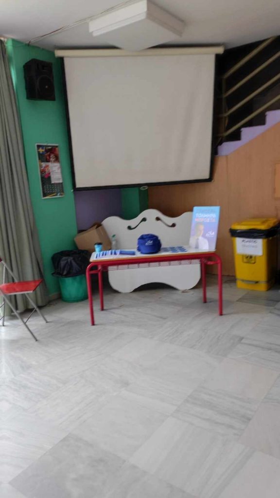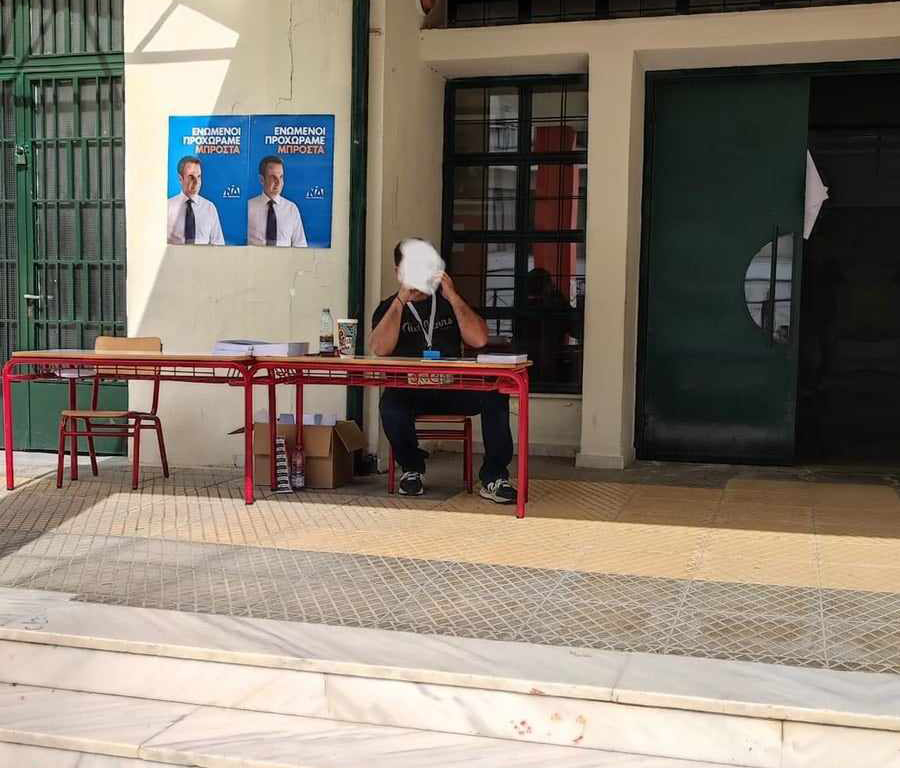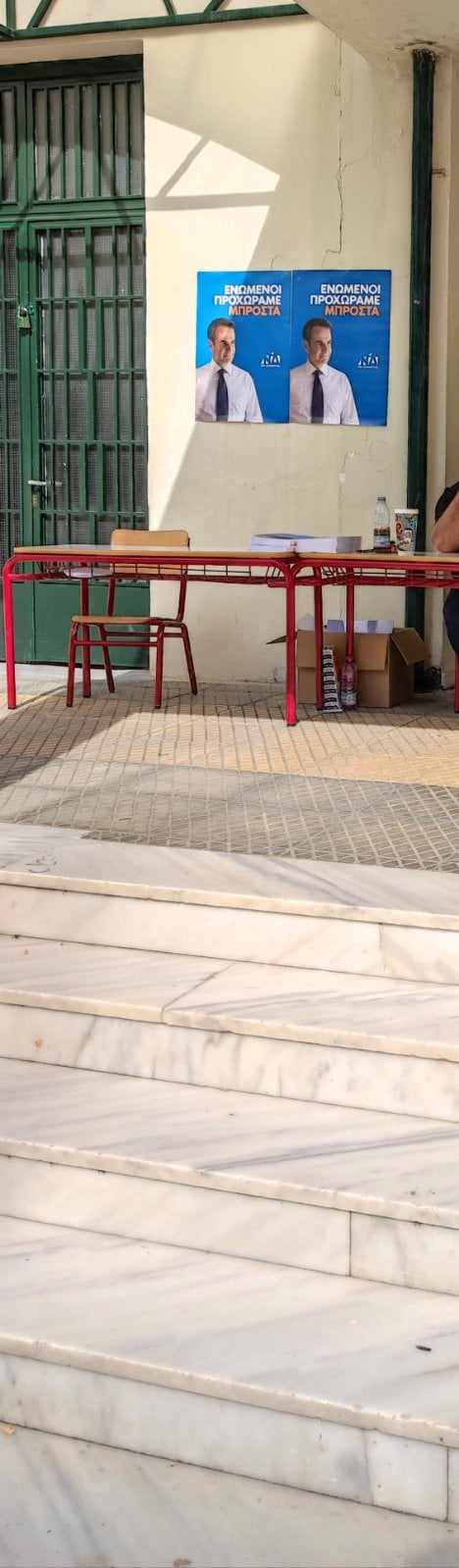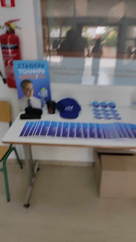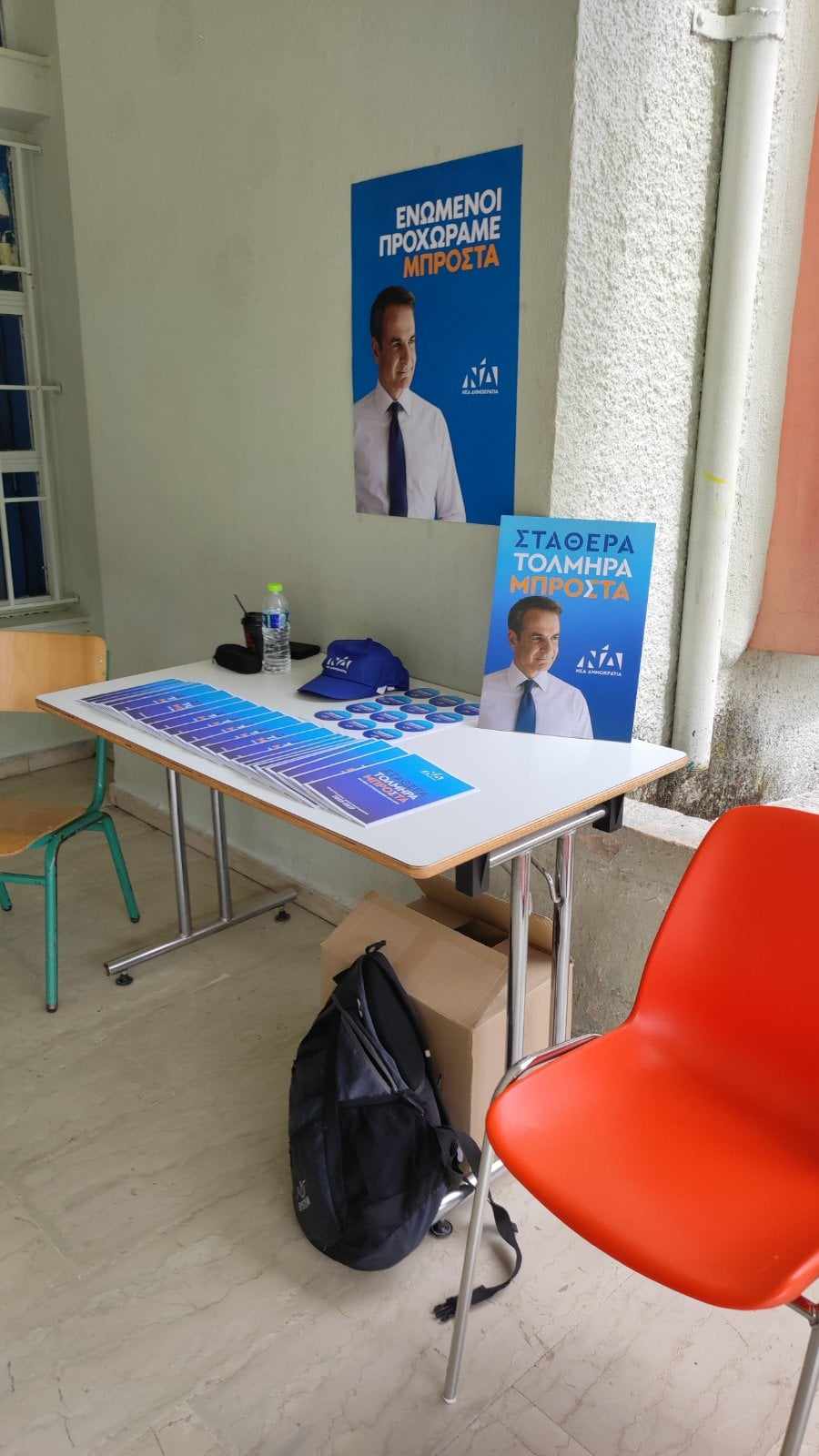 Οι εκλογικοί εκπρόσωποι της ΝΔ αναρτούσαν αφίσες και διένειμαν εκλογικό υλικό του κόμματός τους μέσα στα εκλογικά τμήματα.