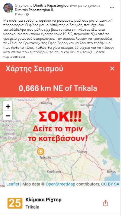 Δυστυχώς διασπείρονται ψευδείς ειδήσεις και μέσω του διαδικτύου προκαλώντας αναστάτωση στον κόσμο που από το μεσημέρι της Τετάρτης, ειδικά στους Νομούς Λάρισας και Τρικάλων, ζει δύσκολες στιγμές με τη γη να τρέμει κάτω από τα πόδια του. Ο Δημήτρης Παπαστεργίου… τρολάρει και ελπίζει να αφυπνίσει τους πολίτες κάνοντας ανάρτηση  όπου αναφέρει ότι “έγκυρη πληροφόρηση από τον Μπάμπη τον σουγιά, αναφέρεται σε επικείμενο σεισμό 25 Ρίχτερ στα Τρίκαλα”!… Δείτε το κείμενο και παρακάτω την ανάρτηση: