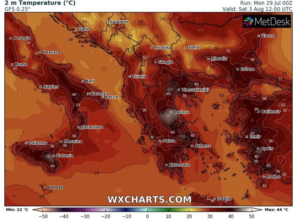 Από το ερχόμενο Σάββατο έως και τις 8/8 αναμένονται εξαιρετικά υψηλές θερμοκρασίες πάνω από τους 40 °C.