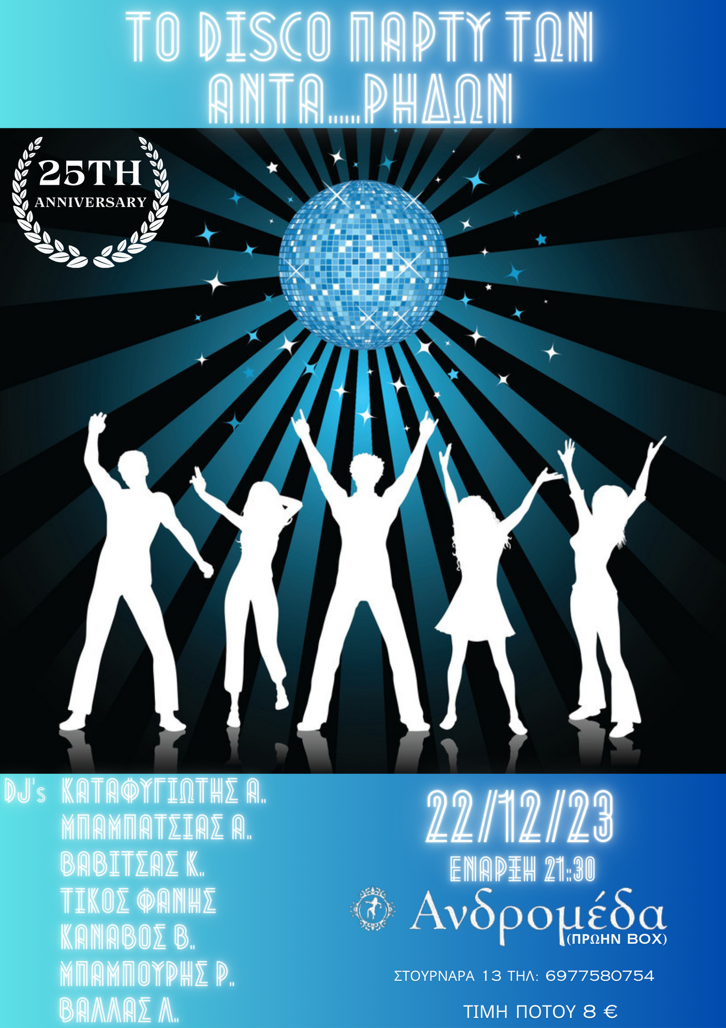 Το ορόσημο Disco πάρτυ των Αντά…ρηδων επετειακά κλείνει τα 25 του χρονιά χτυπώντας και αυτή την φορά limit up με τους Dj’s να απογειώνουν το πάρτυ με τις μουσικές επιλογές, Disco – Pop – Rock & Blues της δεκαετίας του 80, σας περιμένουμε για να χορέψουμε όλοι μαζί κάτω απο την ντισκομπάλα τις μεγαλύτερες επιτυχίες απο τα 80’s. Παρασκευή 22 Δεκεμβρίου στον χώρο του Ανδρομέδα (Πρώην BOX – Μαύρος γάτος) θα παρτάρουμε αστάμάτητα μέχρι να μας σερβίρουν το πρωινό μας.