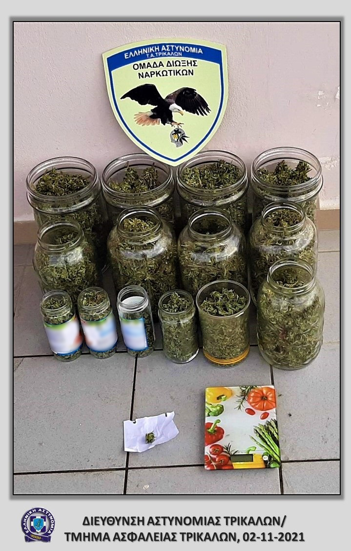 Ειδικότερα, μετά από κατάλληλη αξιοποίηση στοιχείων για διακίνηση ποσοτήτων κάνναβης από το δράστη στην πόλη των Τρικάλων, διενεργήθηκε νομότυπη έρευνα στην οικία του, κατά την οποία βρέθηκαν με τη συνδρομή του αστυνομικού σκύλου ανίχνευσης ναρκωτικών ουσιών “ FLEX ” και κατασχέθηκαν δεκατέσσερα γυάλινα δοχεία και μία χάρτινη συσκευασία με ποσότητες ακατέργαστης κάνναβης, συνολικού βάρους -1.933,5- γραμμαρίων και μια ηλεκτρονική ζυγαριά.