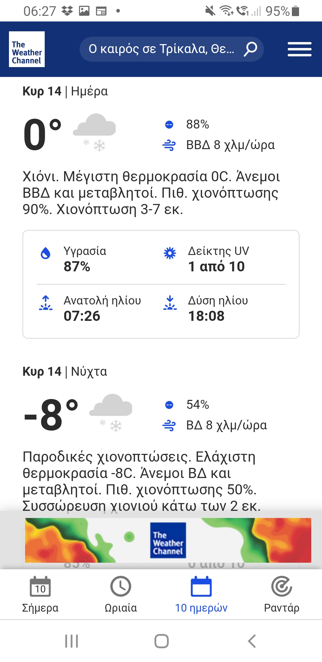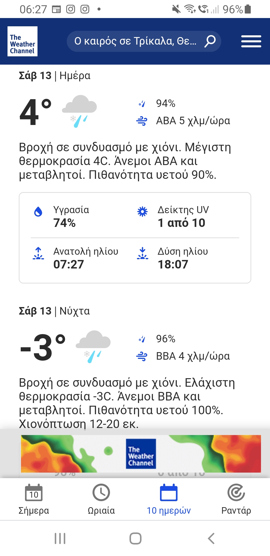 Συγκεκριμένα και σύμφωνα με αυτά φαίνεται να επιβεβαιώνεται ο χιονιάς στην περιοχή μας λίγο νωρίτερα, από το πρωί του Σαββάτου. Μάλιστα δίνεται πρόγνωση για χιονόπτωση 12-20 εκατοστών το Σάββατο μέσα στην πόλη, συν άλλα 7 εκατοστά την Κυριακή. Η θερμοκρασία θα σημειώσει κάθετη πτώση και θα πέσει έως -8 C. Ανάλογα φαινόμενα ασφαλώς αναμένονται και στα ορεινά της περιοχής μας. Η Π.Ε. Τρικάλων, αλλά και οι τέσσερις Δήμοι του Νομού μας έχουν θέσει σε πλήρη ετοιμότητα τον μηχανισμό τους για αντιμετώπιση των καιρικών φαινομένων, εάν ασφαλώς επιβεβαιωθούν τελικά.