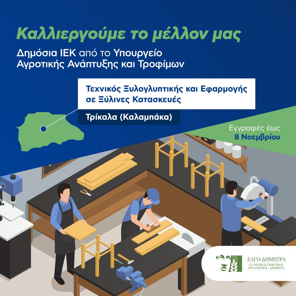 Έως 8 Νοεμβρίου θα συνεχισθούν οι εγγραφές για το διδακτικό έτος 2021- 2022, στα Δημόσια Ινστιτούτα Επαγγελματικής Εκπαίδευσης (ΔΙΕΚ) του ΕΛΓΟ-ΔΗΜΗΤΡΑ. Στο Νομό Τρικάλων με το νέο καθεστώς θα λειτουργήσει στην Καλαμπάκα, το ΔΙΕΚ Τεχνικού Ξυλογλυπτικής και Εφαρμογών Ξύλινων Κατασκευών, δίνοντας στους αποφοίτους του δίπλωμα επαγγελματία, σε ένα κλάδο που τείνει να εκλείψει και απαιτεί ιδιαίτερες δεξιότητες, αλλά όμως αποτελεί έναν κλάδο που όχι μόνο συντηρεί τη λαϊκή και εκκλησιαστική παράδοση αλλά εξελίσσεται και βρίσκει νέα πεδία εφαρμογών στην σύγχρονη τέχνη αλλά και στην καθημερινότητα των πολιτών.