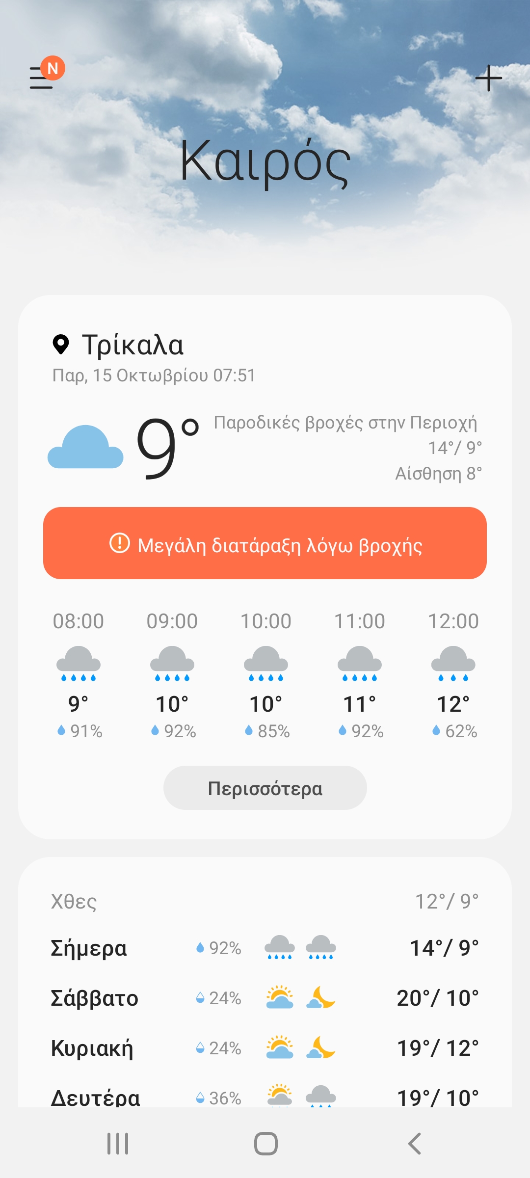 Σύμφωνα με τα στοιχεία που συλλέγει το trikalavoice.gr και σήμερα θα σημειώνονται ασθενείς βροχοπτώσεις καθ’ όλη τη διάρκεια της ημέρας στα Τρίκαλα και στα γύρω χωριά, πιθανόν έντονες κατά τόπους και για λίγη ώρα. Ο καιρός φτιάχνει από το βράδυ, ενώ για το Σαββατοκύριακο προβλέπεται σχεδόν αίθριος, με λίγες νεφώσεις και άνοδο της θερμοκρασίας έως 20 C. Δείτε παρακάτω αναλυτικά την πρόγνωση: