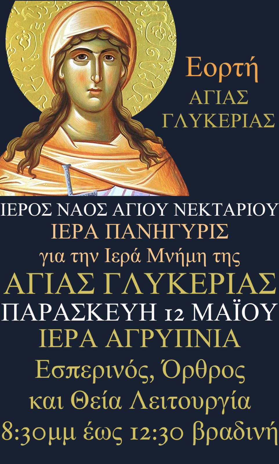 Αγρυπνία επί της εορτής της Αγίας Γλυκερίας το βράδυ της Παρασκευής στον Ι.Ν. Αγίου Νεκταρίου