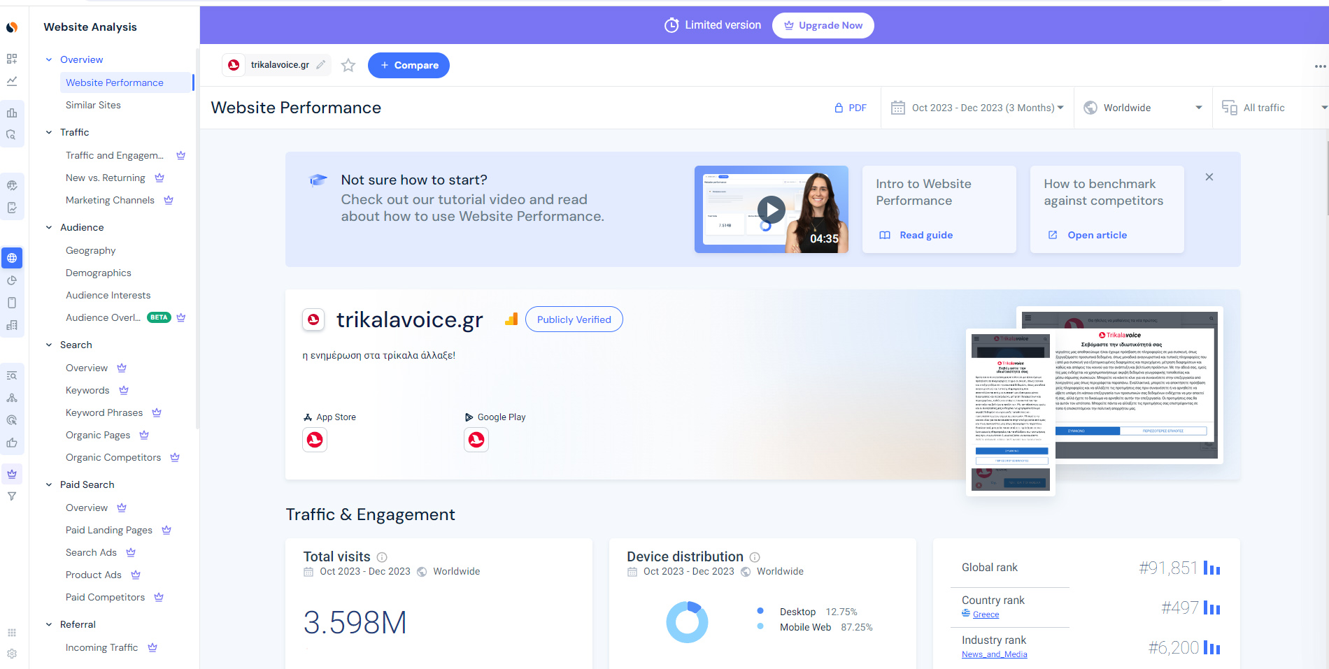 Επιβεβαιώθηκε μέσα από την πλατφόρμα μετρήσεων της similarweb, η οποία κατέγραψε 3.598.000 αναγνώστες το τρίμηνο αυτό, επιβεβαιώνοντας σταθερά το trikalavoice.gr ως ένα από τα κορυφαία επαρχιακά site.
