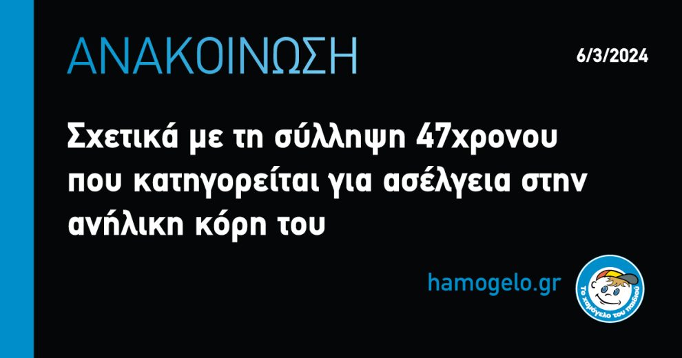 “Μετά από ενημέρωση της ΕΛ.ΑΣ. και της δημοσιότητας που έλαβε η σύλληψη άνδρα με την κατηγορία ότι ασέλγησε σε βάρος της ανήλικης κόρης του, θα θέλαμε να ενημερώσουμε ότι: