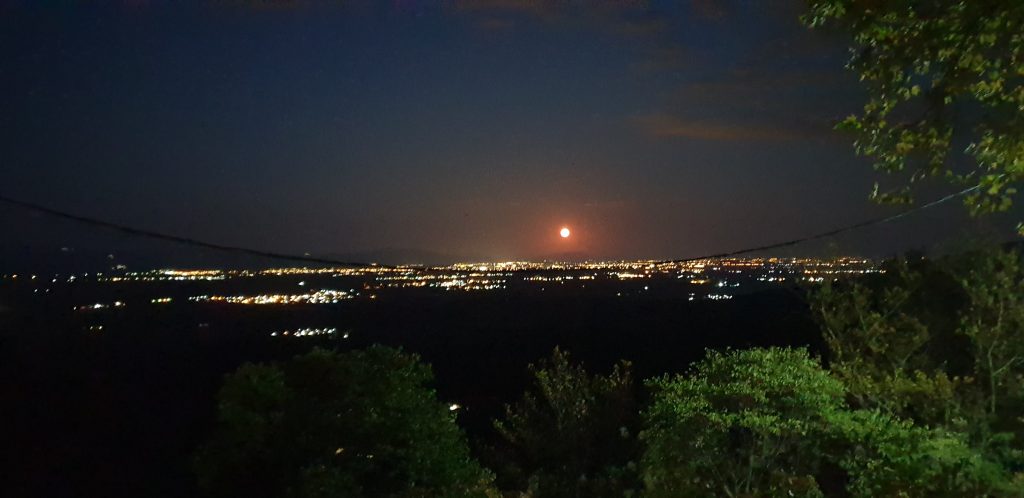 Η φωτογραφία έχει ληφθεί από το Ξυλοπάροικο, το “μπαλκόνι του Κόζιακα”, και διακρίνεται το ολόγιομο φεγγάρι πάνω από την πόλη και τον κάμπο των Τρικάλων.