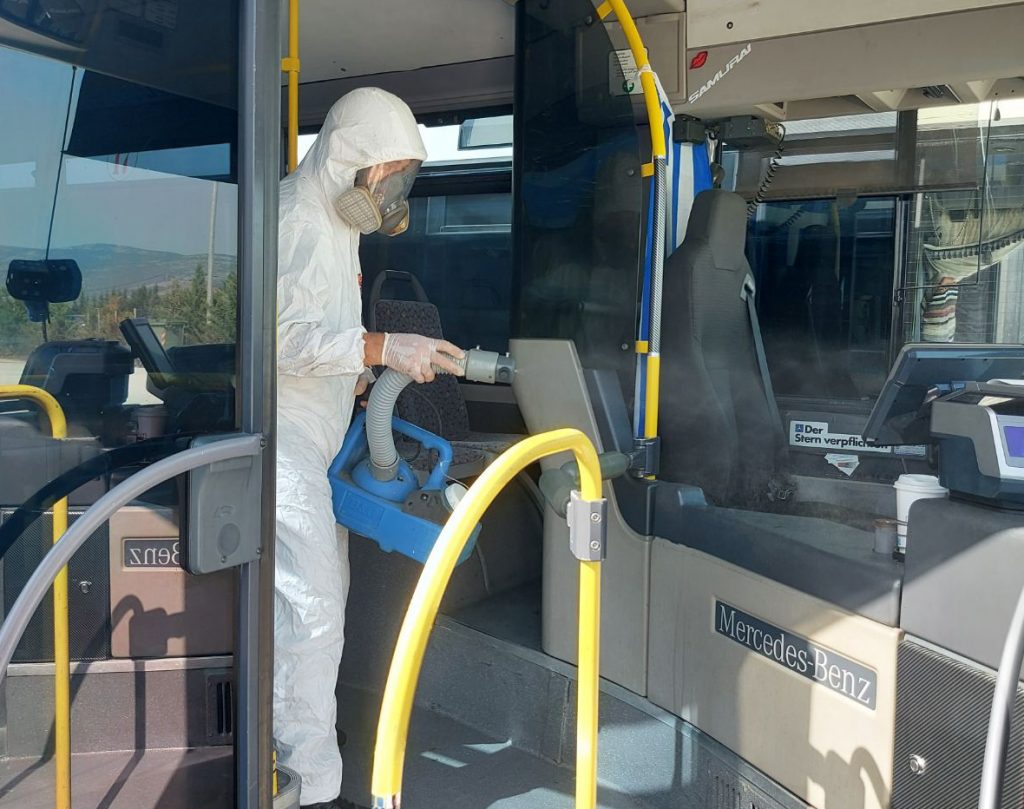 Έτσι το πρωί της Παρασκευής ειδικό συνεργείο προχώρησε σε απολύμανση όλων των λεωφορείων που θα χρησιμοποιηθούν για τις μετακινήσεις μαθητών και πολιτών.