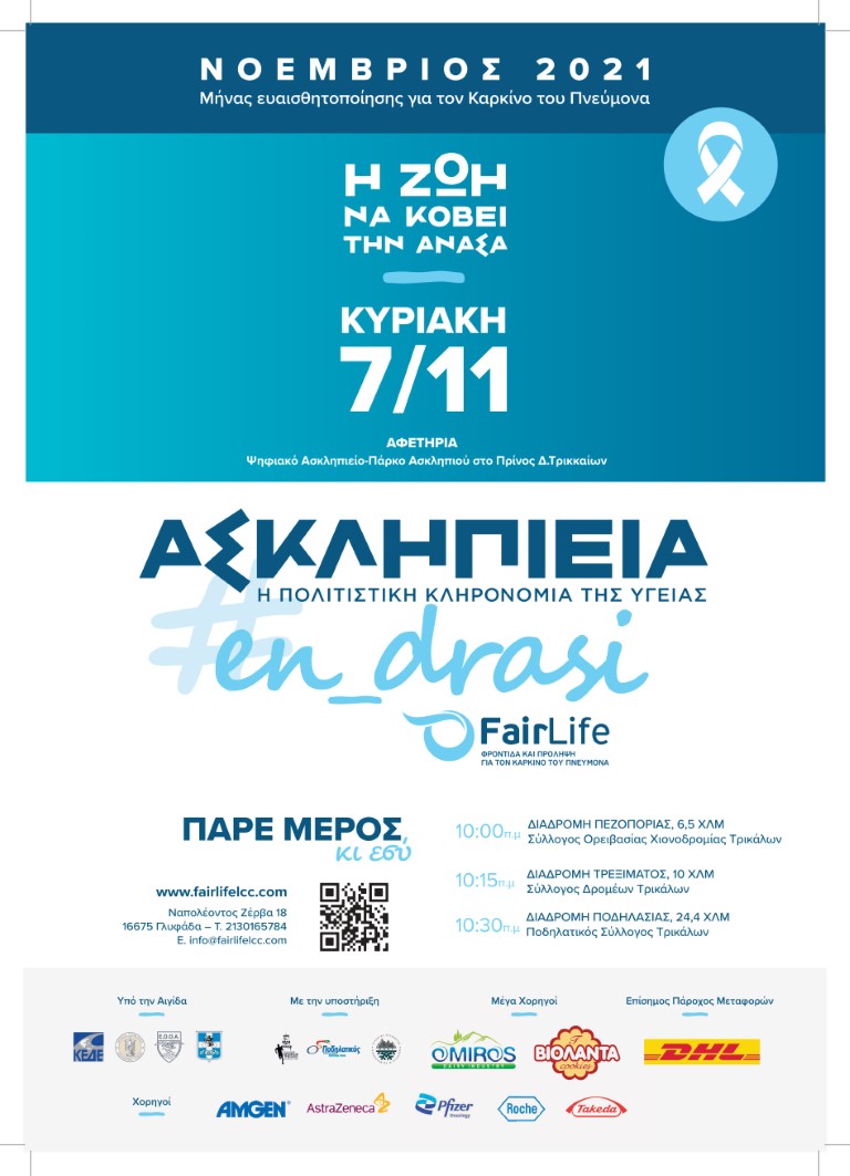 Υπό την αιγίδα του Δήμου Τρικκαίων διοργανώνεται τον Νοέμβριο,  σειρά δράσεων και εκδηλώσεων για τον καρκίνο του πνεύμονα από την FairLife. Η «FairLife L.C.C. – Φροντίδα και Πρόληψη για τον Καρκίνο του Πνεύμονα», ο πρώτος μη κερδοσκοπικός οργανισμός για τον καρκίνο του πνεύμονα στη χώρα μας, όλο τον Νοέμβριο, μήνα Ενημέρωσης και Ευαισθητοποίησης για τον καρκίνο του πνεύμονα θα βρίσκεται #en_drasi στο διαδίκτυο, προσπαθώντας να ευαισθητοποιήσει την Πολιτεία και το ευρύτερο κοινό ότι η πρόληψη του Καρκίνου του Πνεύμονα με συγκεκριμένες εξετάσεις και η έγκαιρη διάγνωση σώσει ζωές.