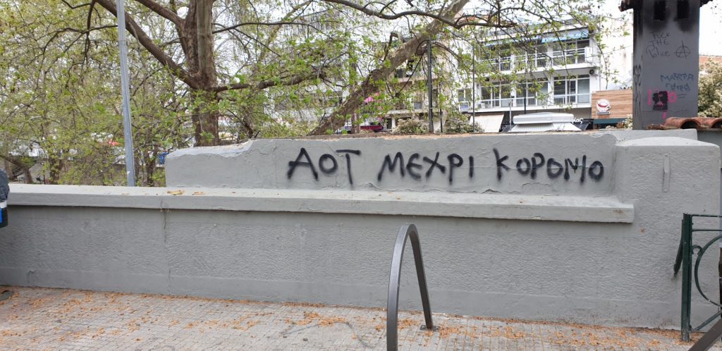 Ε τα έγραψε όλα ο άνθρωπος που εμπνεύστηκε αυτό το σύνθημα. Στη γέφυρα της πλατείας Κιτριλάκη φίλαθλος του ιστορικού Α.Ο. Τρίκαλα το έγραψε πιο.. επίκαιρα από ποτέ… «ΑΟΤ μέχρι κορονιό»!!! Άντε και ανεβαίνει κατηγορία φέτος η… αρρώστια.