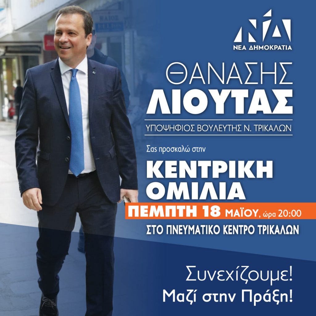 Πέμπτη 18 Μαΐου, στις 20:00 μ.μ., στο Πνευματικό Κέντρο Τρικάλων, ο εκ νέου υποψήφιος βουλευτής του Νόμου μας Θανάσης Λιούτας, δίνει ραντεβού με όλες και όλους, στην εκδήλωση που θα πραγματοποιηθεί για την κεντρική του ομιλία.