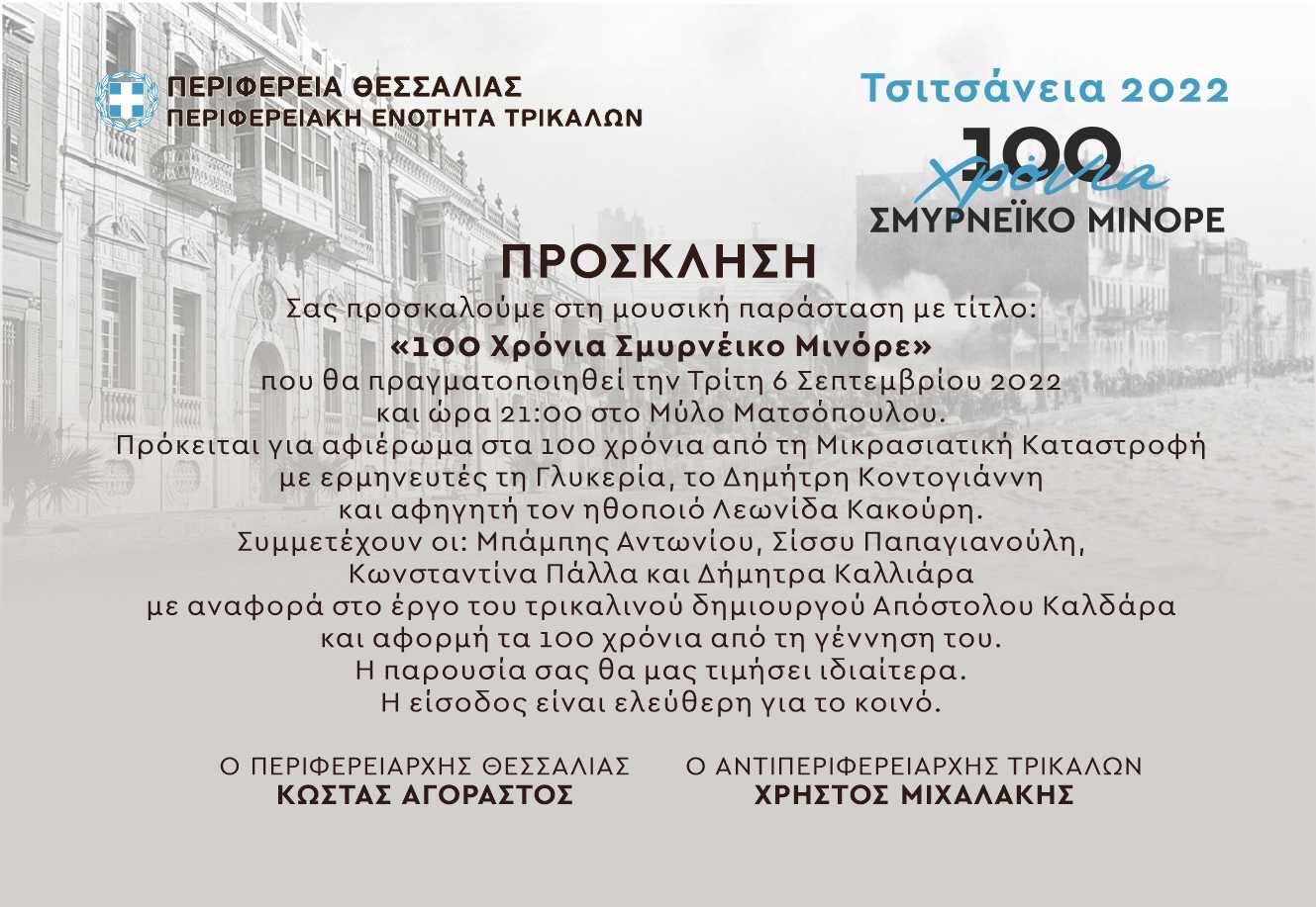 Η συναυλία, που είναι αφιερωμένη στα 100 χρόνια από τη Μικρασιατική Καταστροφή, θα πραγματοποιηθεί την Τρίτη στις 9 μ.μ. στον αύλειο χώρο του Μύλου Ματσόπουλου και θα τραγουδήσουν οι Γλυκερία και ο Δημήτρης Κοντογιάννης. Ο αντιπεριφερειάρχης Χρήστος Μιχαλάκης μιλάει για μια από τις πιο σημαντικές πολιτιστικές παρεμβάσεις στην περιοχή μας και καλεί τον κόσμο να συμμετάσχει, καθώς η είσοδος είναι ελεύθερη. Δείτε την πρόσκληση: