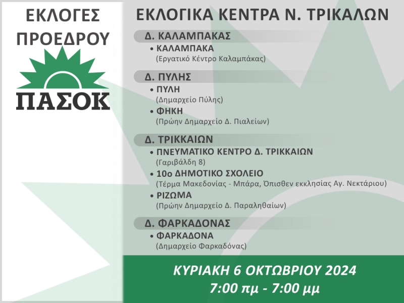 Οι κάλπες θα ανοίξουν στις 7 το πρωί της Κυριακής 6/10 και θα κλείσουν στις 7 το απόγευμα της ίδιας μέρας, εκτός και αν λόγω της μαζικής προσέλευσης κριθεί αναγκαία η παράταση της εκλογικής διαδικασίας. Δικαίωμα ψήφου έχουν όλοι οι Έλληνες πολίτες και οι αλλοδαποί που κατοικούν μόνιμα και νόμιμα στην Ελλάδα και είναι 16 ετών και πάνω.