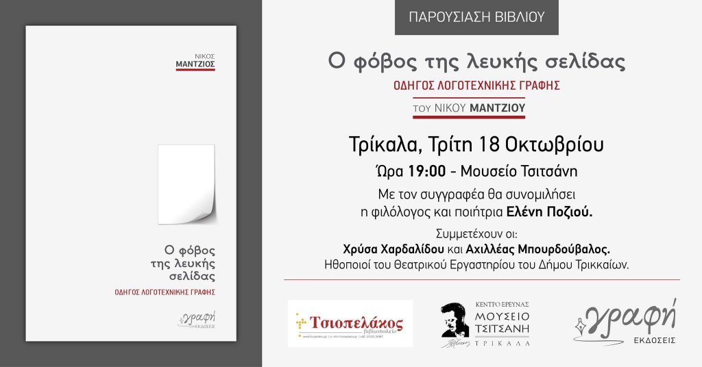 Οι εκδόσεις Γραφή και το βιβλιοπωλείο Τσιοπελάκος σας προσκαλούν στην παρουσίαση του βιβλίου “Ο φόβος της λευκής σελίδας. Οδηγός λογοτεχνικής γραφής“, του συγγραφέα Νίκου Μάντζιου, την Τρίτη 18 Οκτωβρίου, στις 7 το απόγευμα, στο Μουσείο Τσιτσάνη.