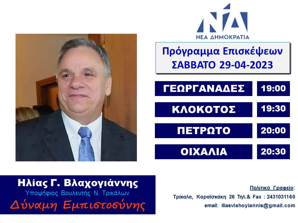 -Με μεγάλη συμμετοχή πολιτών συνεχίζονται οι περιοδείες-ομιλίες του πρ.Νομάρχη- Βουλευτή και εκ νέου υποψηφίου Ηλία Βλαχογιάννη.