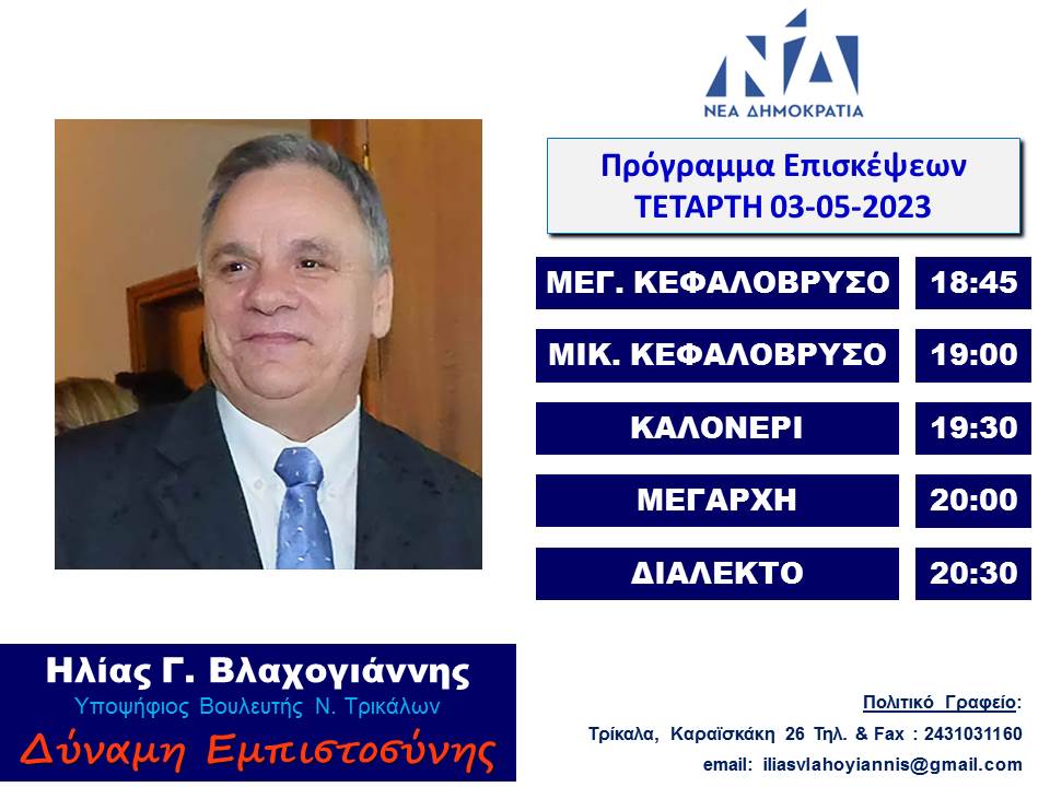 Με μαζική παρουσία πολιτών, συνεχίζεται η προεκλογική εκστρατεία του πρ. Νομάρχης-Βουλευτής και εκ νέου υποψηφίου Ηλία Βλαχογιάννη, σε χωριά του Νομού μας.