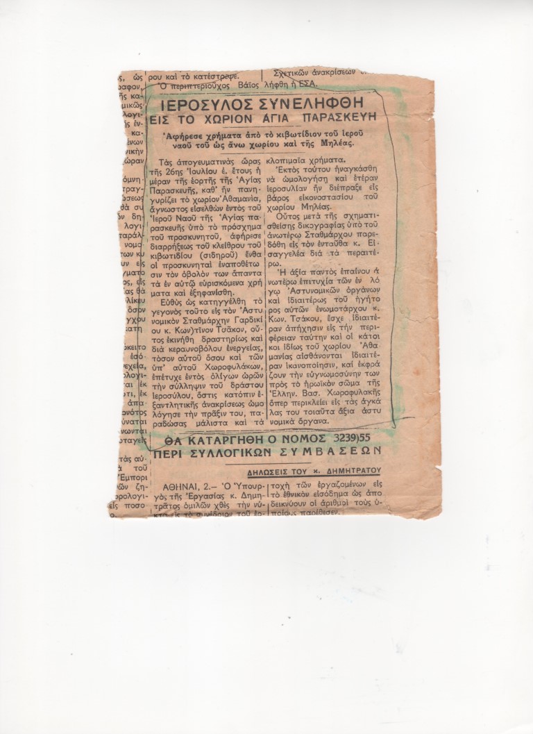 Χαρακτηριστική η υπόθεση που ανασύρει σήμερα από το αρχείο το trikalavoice.gr και αφορά περίπτωση ιερόσυλου ο οποίος διέρρηξε τον Ιερό Ναό Αγίας Παρασκευής στη Τζούρτζια Ασπροποτάμου, ανήμερα μάλιστα της εορτής της Αγίας Παρασκευής, στα τέλη της δεκαετίας του ΄50. Ο Ενωματάρχης, τότε, Κωνσταντίνος Τσιάκος ενημερώθηκε τότε και «εκινήθη δραστηρίως και δια κεραυνοβόλου ενεργείας, τόσον αυτού, όσου και των υπ’ αυτού  χωροφυλάκων, επέτυχε εντός ολίγων ωρών την σύλληψη του δράστου ιεροσύλου, όστις κατόπιν εξαντλητικής ανακρίσεως ωμολόγησε την πράξιν του, παραδώσας μάλιστα και τα κλοπιμαία χρήματα». Δείτε παρακάτω το χαρακτηριστικό απόσπασμα από δημοσίευμα της εποχής.