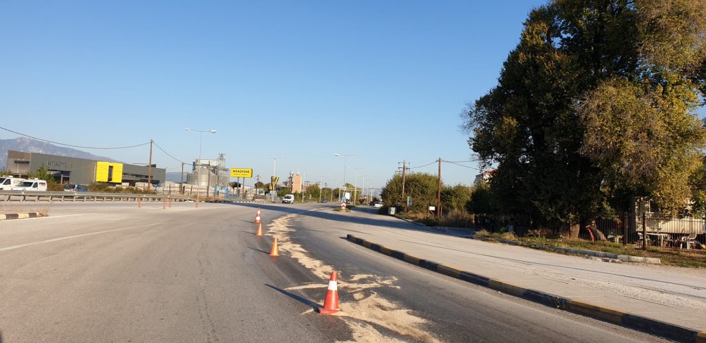 Τοποθετήθηκαν κώνοι για να είναι προσεκτικοί οι οδηγοί και από νωρίς το πρωί του Σαββάτου συνεργεία του Δήμου με επικεφαλής τον αντιδήμαρχο Καθαριότητας Γιώργο Ζιώγα, αλλά και άντρες και γυναίκες της Τροχαίας προσπαθούν να καθαρίσουν το δρόμο και ρίχνουν πριονίδι.