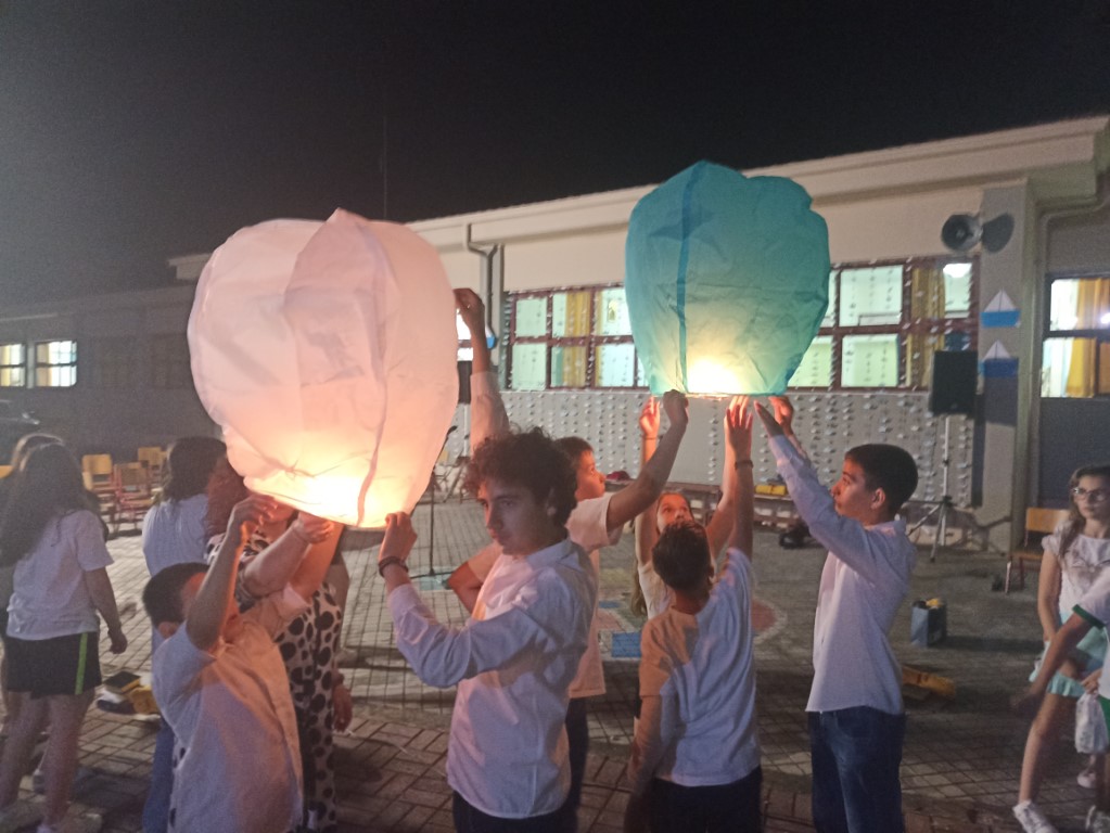 Ο σύλλογος γονέων στο τέλος της γιορτής μαζί με τους εκπαιδευτικούς μοίρασε στους μαθητές της έκτης τα αναμνηστικά τους και αποχαιρετήσαμε την χρονιά που πέρασε γεμίζοντας τον Τρικαλινό ουρανό με μπαλόνια και φαναράκια .